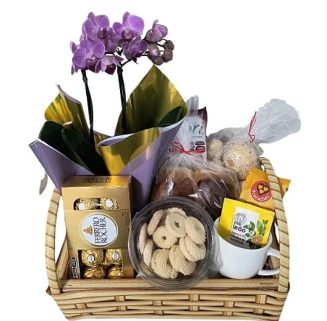 01 mini orquidea, 01 caneca sortida 01 ferreiro rocher 100 gr, 01 chá, 01 capuccino, 01 croassan, 01 porcão de biscoitos , 01 geleia francesa,02 mini pães, 01 suco natural,01 bandeja tamanho p, de vime artificial.